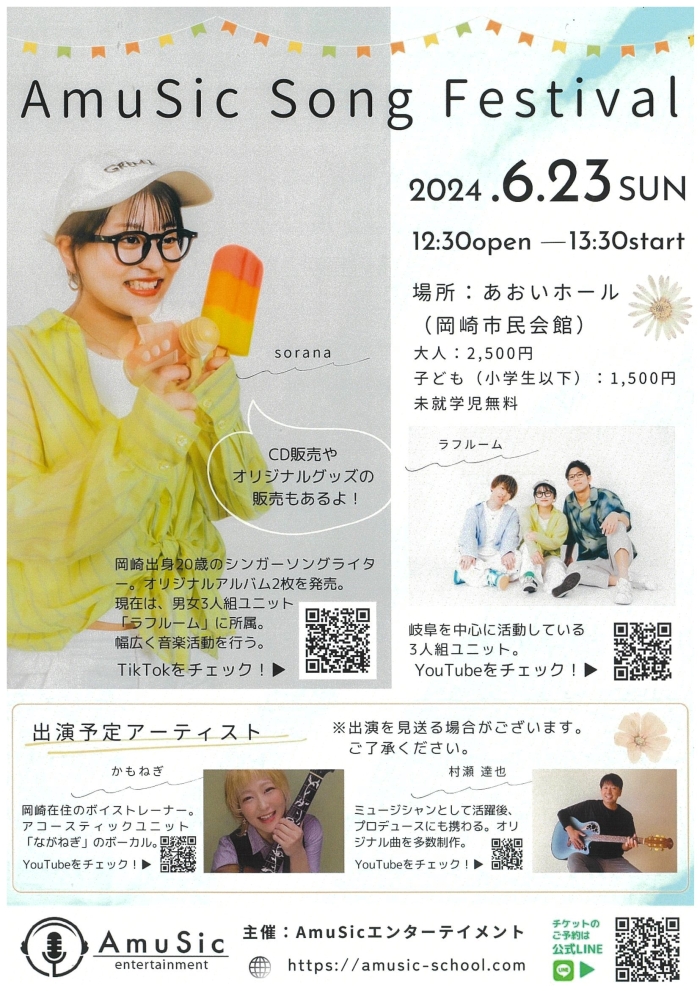 「AmuSic Song Festival」を開催します。 2024年06月04日(火) 岡崎市民会館 あおいホールにおいて、2024年6月23日(日)に「AmuSic Song Festival」を開催します。 みなさまのご来場を心よりお待ちしています。 Amusic エンターテイメント